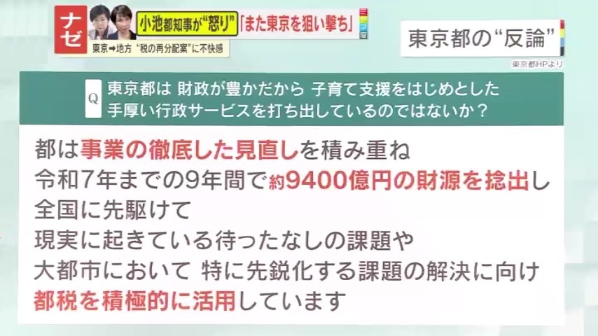 東京都の担当者によると「今、税制改正が議論される中、東京都から税をもっと取るべきだという話も出ている」ということです。