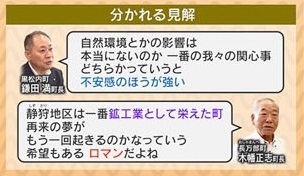 また、自治体の町長同士も見解が分かれています。「自然環境などの影響は本当にないのか、一番の我々の関心事。どちらかというと不安感のほうが強い」と話す黒松内町・鎌田満町長に対し、長万部町・木幡正志町長は「静狩地区は一番、鉱工業として栄えた町。再来の夢がもう一回起きるのかなという希望もある。ロマンだよね」と語っています。