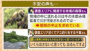ただ、地元では不安の声が上がっています。調査エリアに隣接する牧場の森塚さんは、「牧場の中に流れる川は、牛の水飲み場。鉱毒で川が汚染されるのでは…」と、掘削の中止を求めています。また、調査エリア近くでアユ釣りをする千葉さんも、企業側は有毒なものは出さないと言っていたものの、「いくら出さないと言っても出るんですよ」と訴えました。