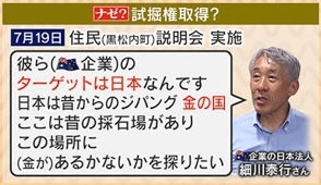 『キンギンエクスプロレイション』日本法人・細川泰行さんは、「彼ら(オーストラリアの企業)のターゲットは、日本なんです。日本は昔からのジパング・金の国。ここは昔の採石場があり、この場所に金があるかないかを探りたい」と説明しました。