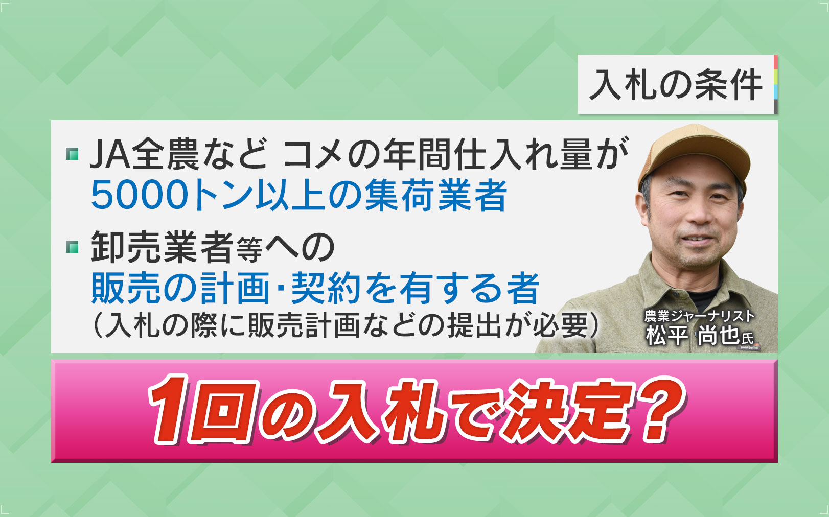 松平氏によると、入札の条件は『JA全農などコメの年間仕入れ量が5000トン以上の集荷業者』や『卸売業者等への販売計画・契約を有する者(入札の際に販売計画などの提出が必要)』となっていて、1回の入札で決定するのではないかとの見解を示しています。