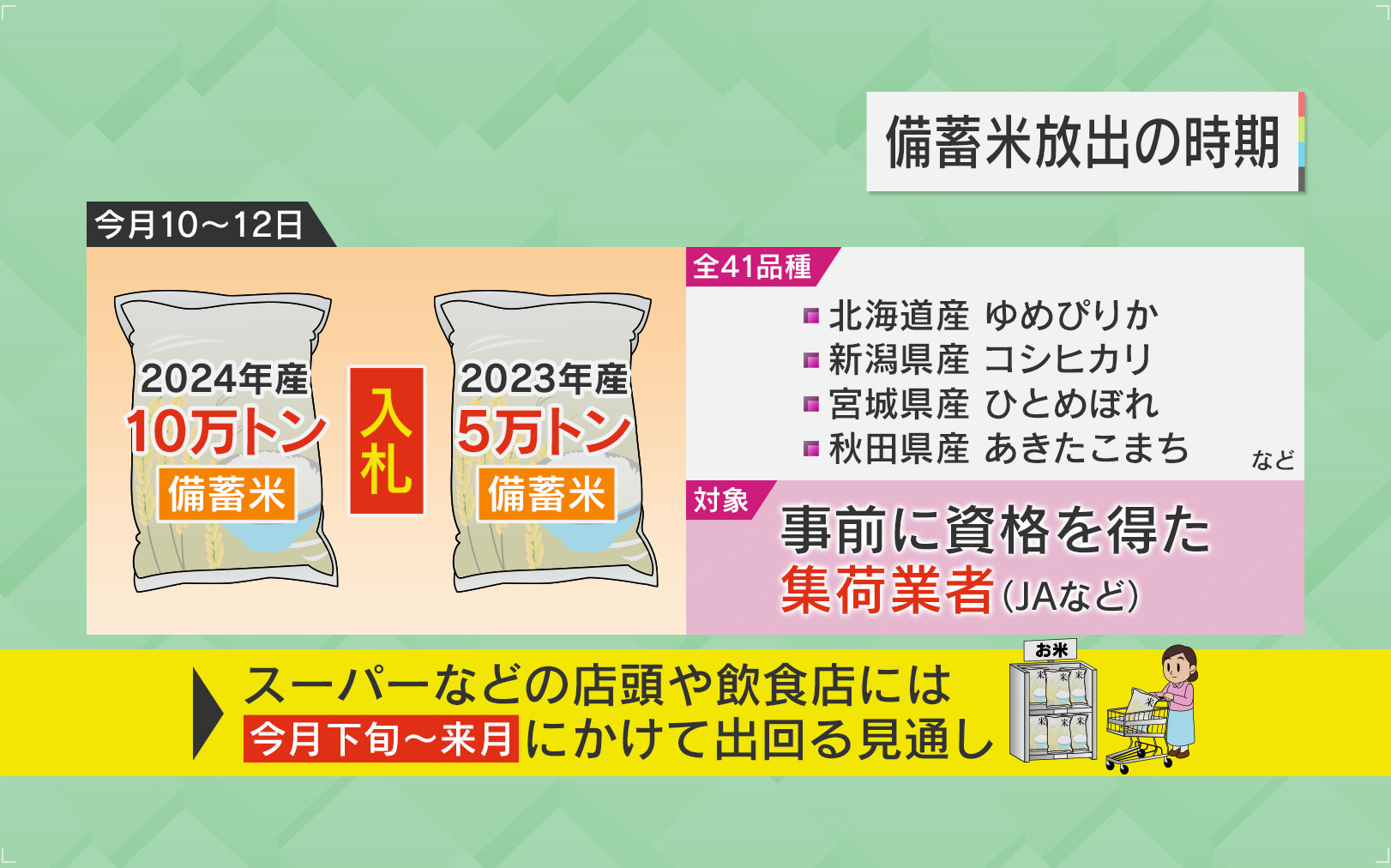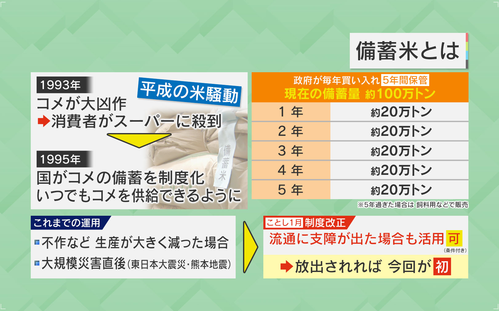 「備蓄米は災害か著しい凶作・不作の年にだけ放出できるものでしたが、『流通における目詰まり』を理由に、今回初めて放出されることになりました」