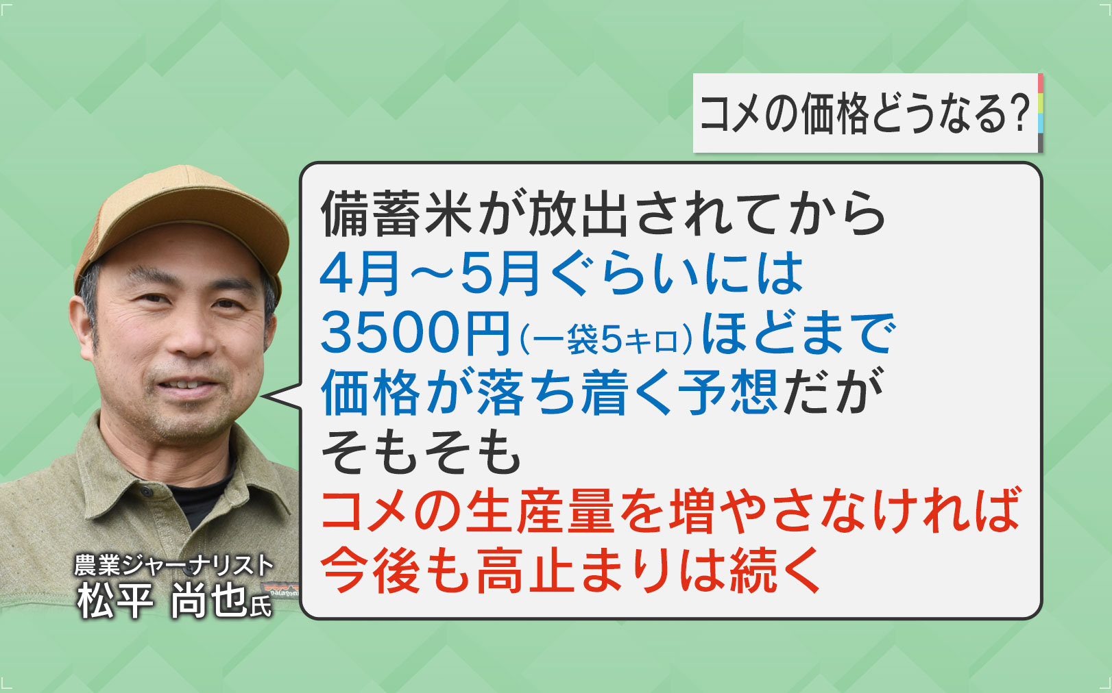備蓄米が放出される一方、コメの価格について松平氏は、「備蓄米が放出されてから4~5月ぐらいには3500円(一袋5キロ)ほどまで価格が落ち着く予想だが、そもそもコメの生産量を増やさなければ、今後も高止まりは続く」と話しています。