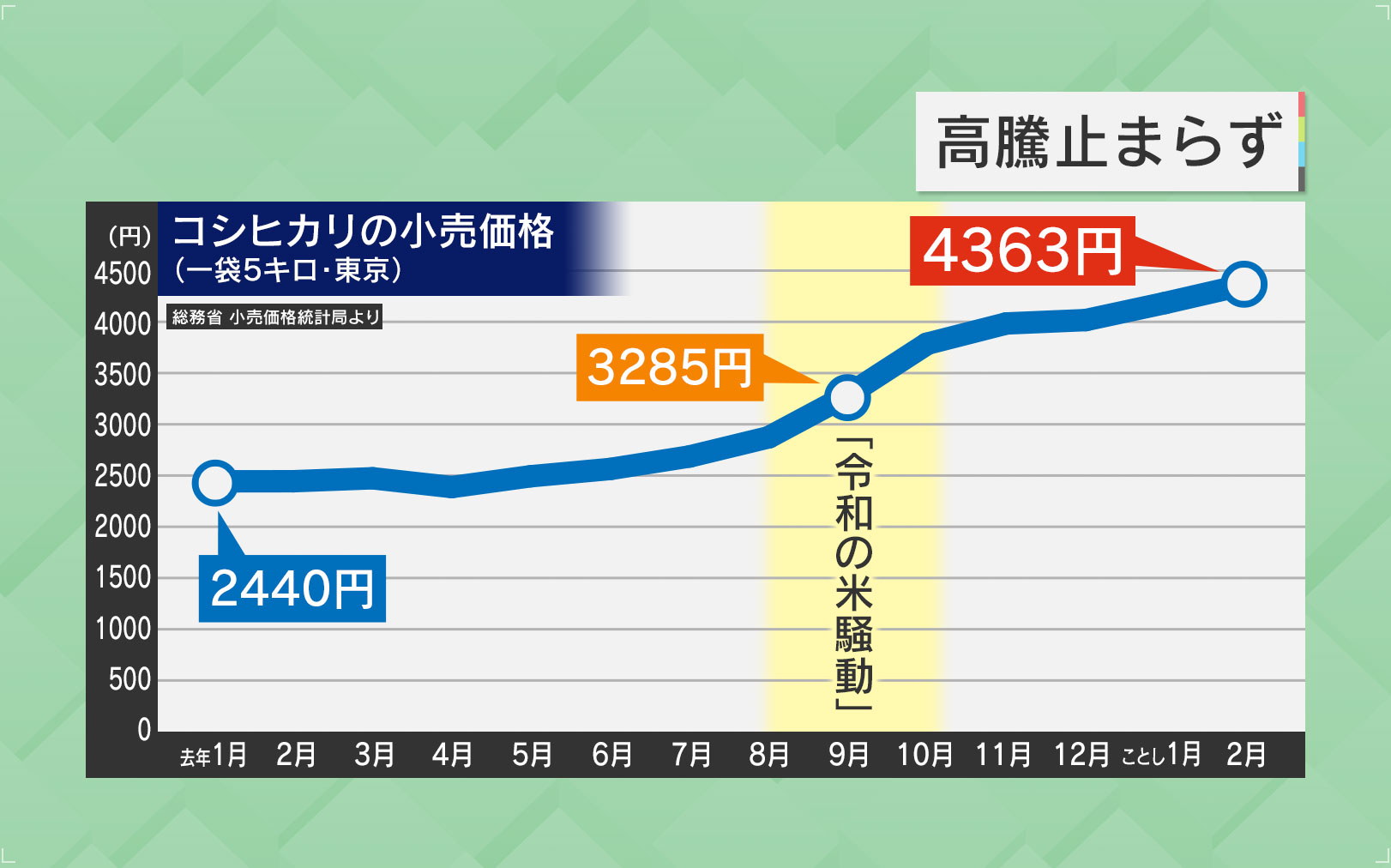 2025年3月4日、大阪市内のスーパーでは、コメの価格が軒並み5キロ4000円超(税抜き)と高値が続いていました。買い物客からは、「この値段なら、以前は10キロ買えていた。『仏壇に、ご飯を供えないといけないけど、パンを供えている』と誰かが言っていました」といった声が聞かれました。