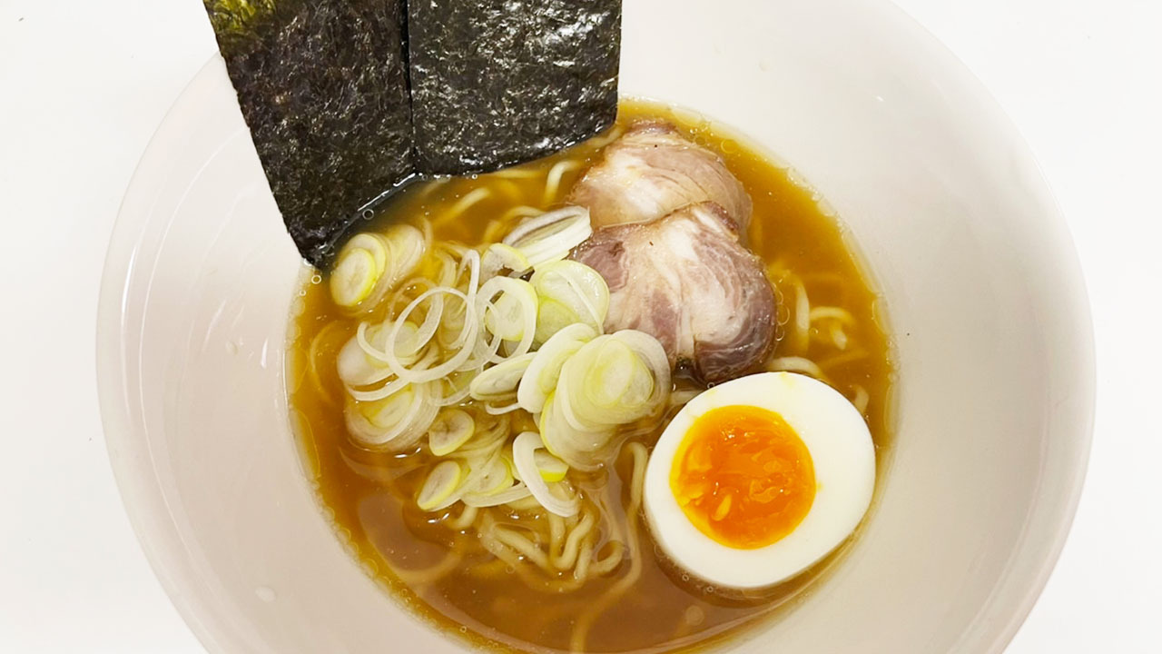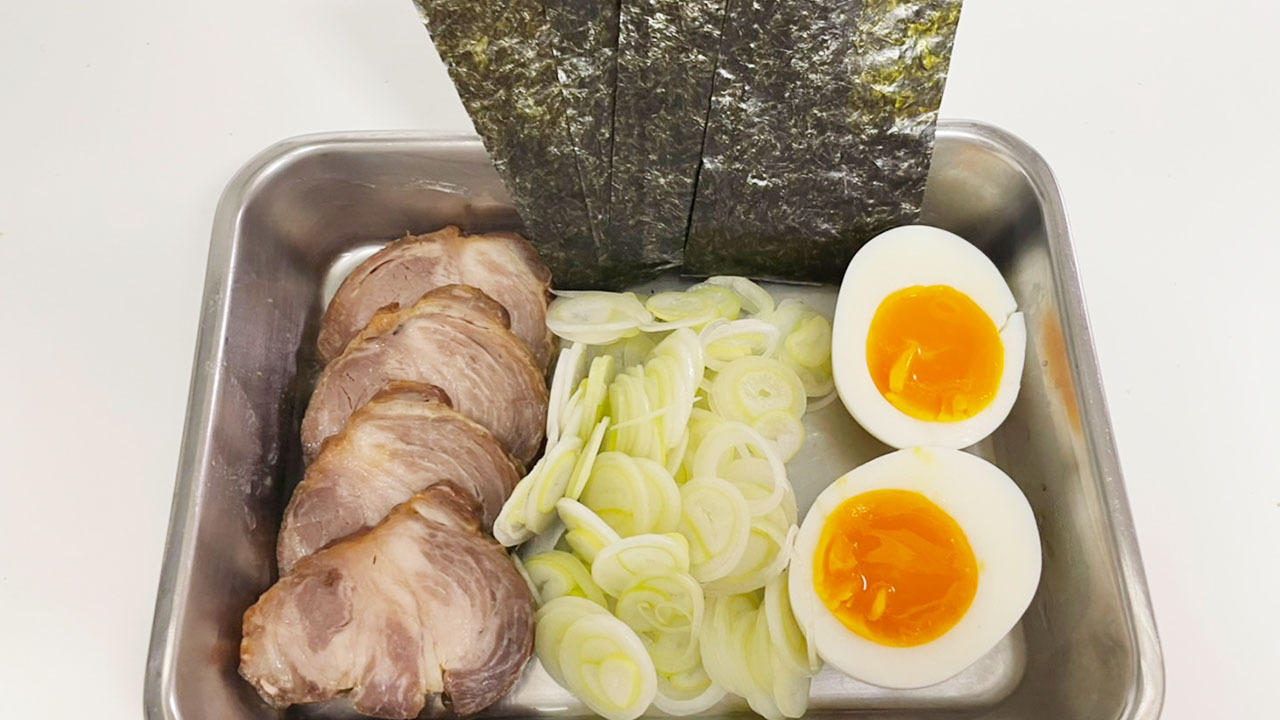 ⑥ お好みでゆで卵、チャーシュー、輪切りにした1/3の長ネギをトッピングする。