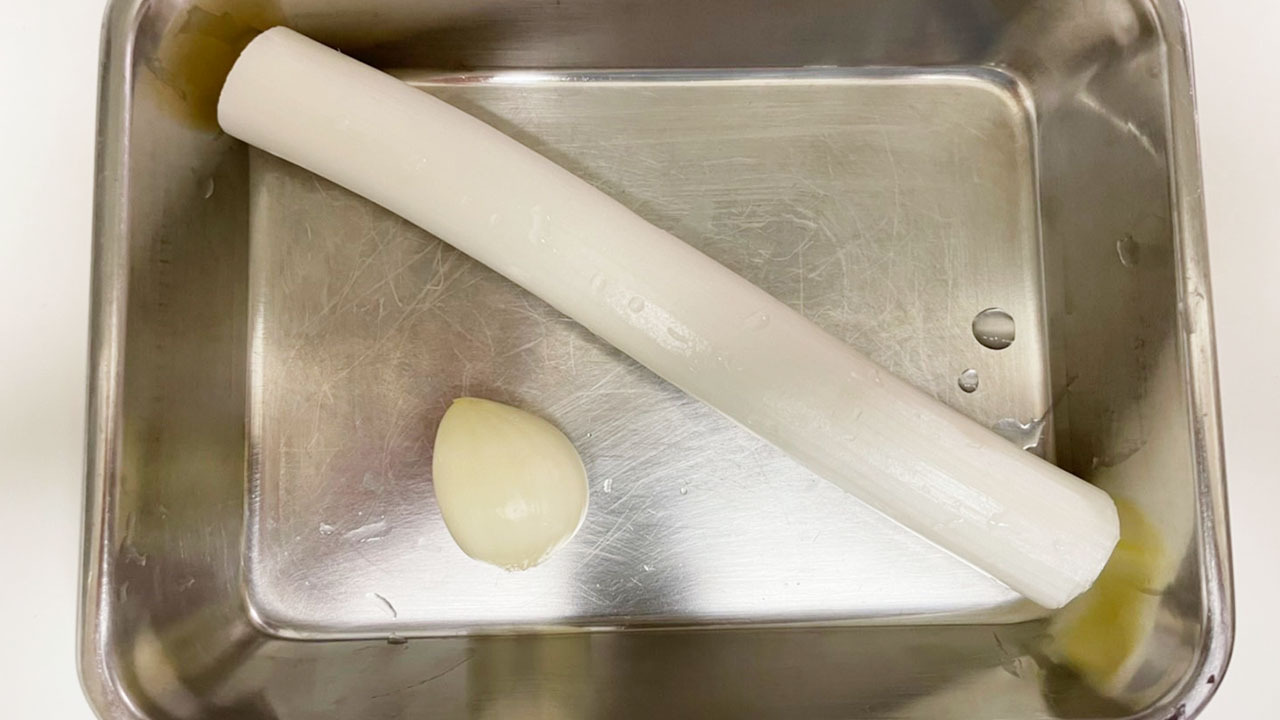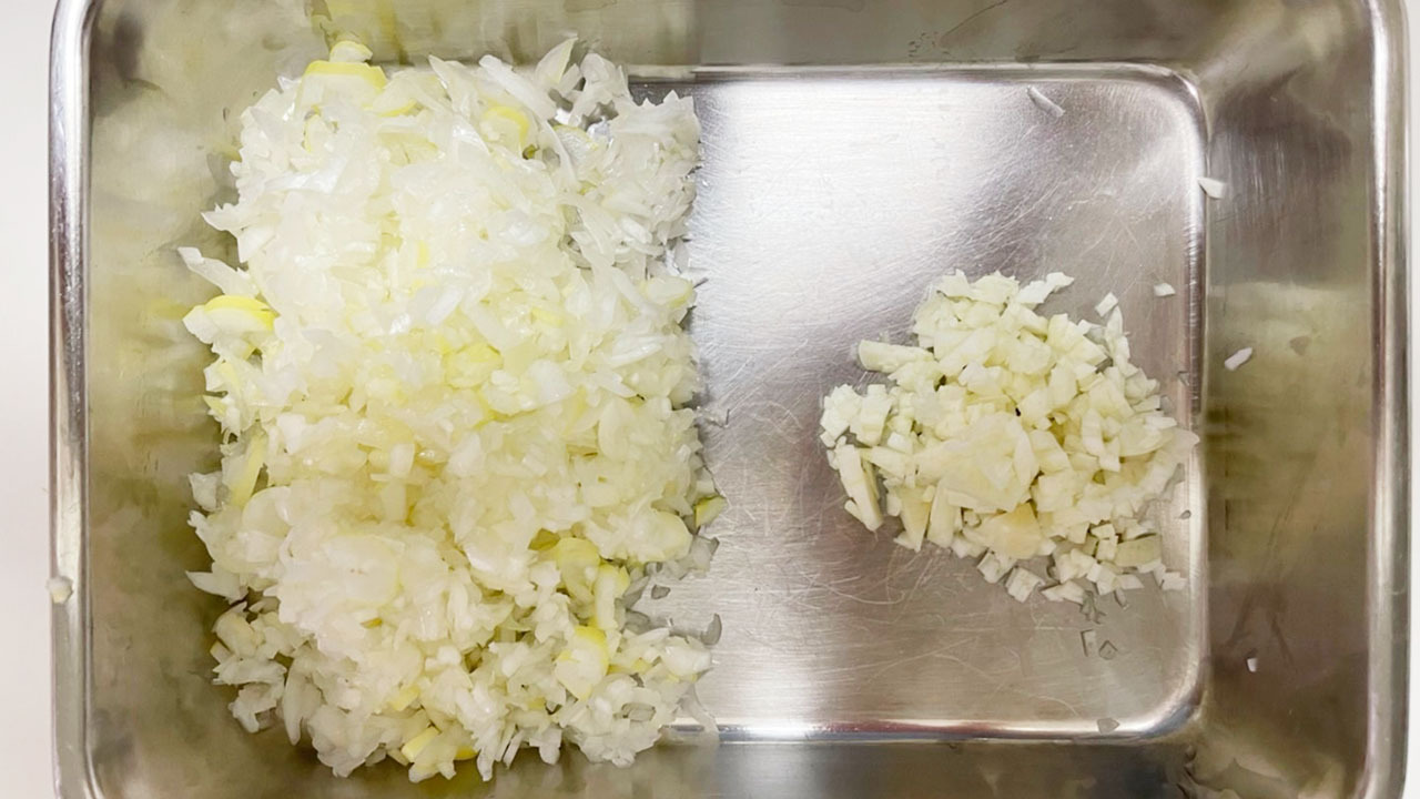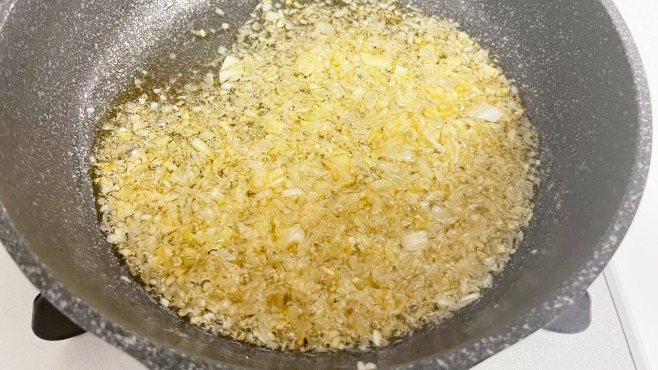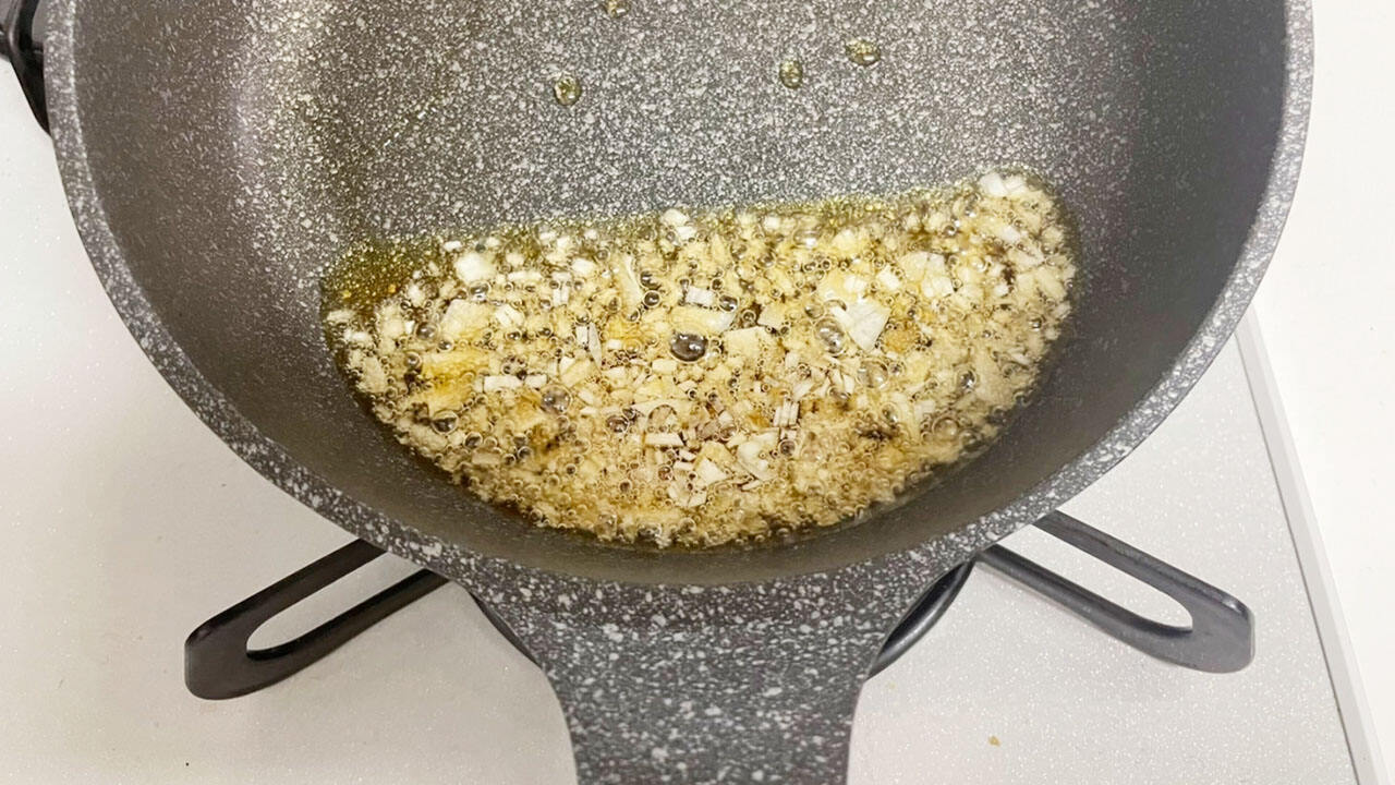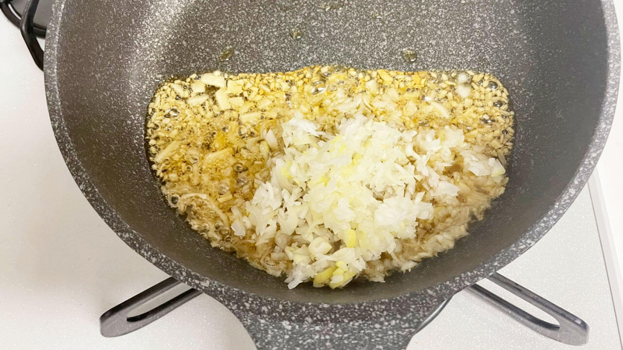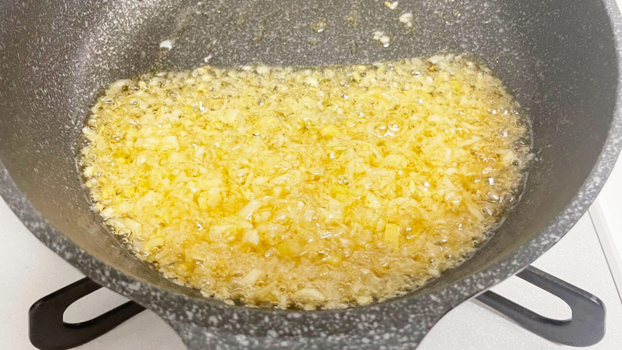 ② 長ネギの2/3とニンニクをみじん切りにし、大さじ3のごま油で焦げない程度に炒める。