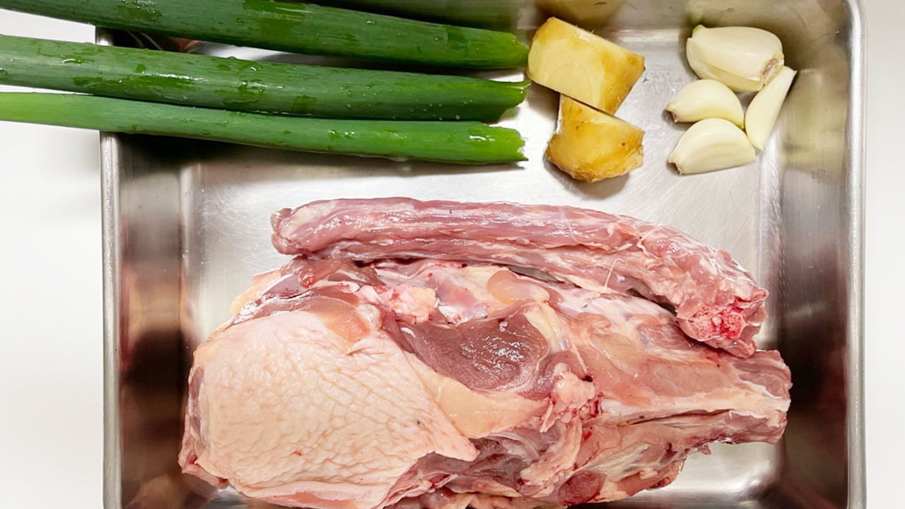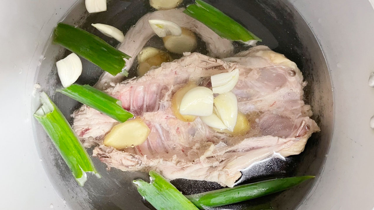 ① スープの材料を鍋に入れ、水が1リットルくらいになるまで鶏ガラを煮る。(3時間くらい)