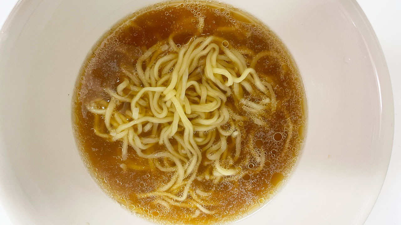 ⑤ 麺が茹で上がったら、器に鶏ガラスープを350ccと麺をいれて、湯切りしたラーメンをいれる。