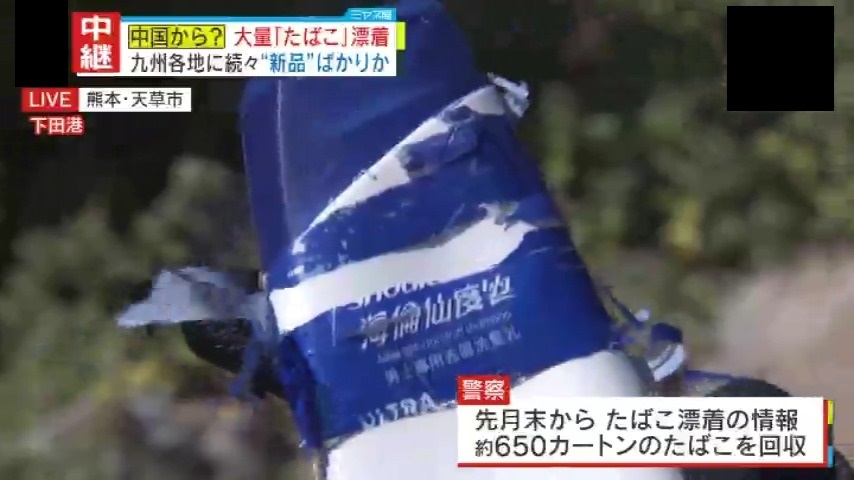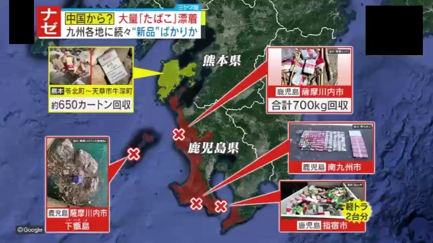 ただ、海は繋がっているため、『ミヤネ屋』は天草市から南の東シナ海に面した自治体を取材。すると、苓北町・天草市の650カートンを皮切りに、鹿児島県では薩摩川内(さつませんだい)市内だけでなく、下甑島(しもこしきしま)でも。南九州市では1644箱、指宿市では軽トラの荷台いっぱいのタバコを地元の役場が回収していることが判明しました。
