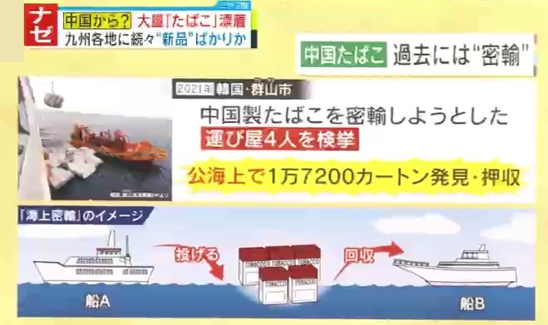 中国のタバコを巡っては、過去に『密輸』がありました。2021年、韓国・群山市で、中国製タバコを密輸しようとした運び屋4人を検挙。公海上で1万7200カートンを発見・押収しました。“海上密輸”は、「船Aが海に投げ入れたタバコを船Bが回収する」ということですが、その際に回収しきれなかったものが発見されたということです。