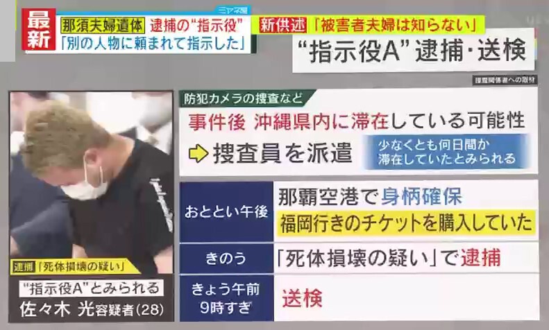 4月29日、「死体損壊の疑い」で逮捕されたのが、“指示役A”とみられる佐々木光容疑者(28)です。防犯カメラの捜査などから、事件後は沖縄に滞在している可能性があるとされ、捜査員を派遣していました。佐々木容疑者は少なくとも何日間か滞在していたとみられ、28日午後に那覇空港で身柄が確保されました。その際、福岡行きのチケットを購入していて、逃亡する可能性があったということです。29日に逮捕、30日午前9時すぎに送検されました。