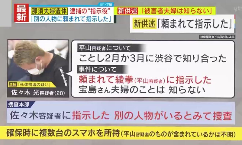 佐々木容疑者は、「宝島さん夫婦のことは知らない」と供述しています。また、確保時には複数台のスマホを所持していました。平山容疑者が「Aさんにスマホを取られた」と供述していることがわかっていますが、この中に平山容疑者のものが含まれていたかはわかっていません。