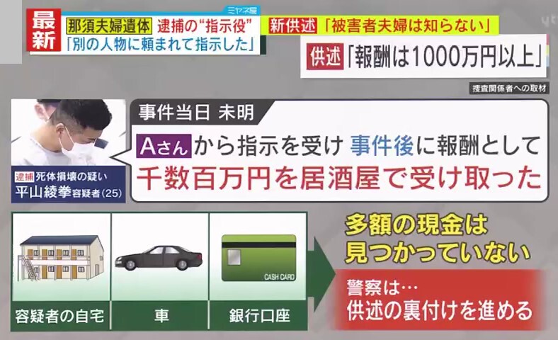 また、平山容疑者は「事件当日の未明、Aさんから指示を受け、事件後に報酬として千数百万円を居酒屋で受け取った」と供述しているということですが、容疑者の自宅・車・銀行口座からも多額の現金は見つかっていません。