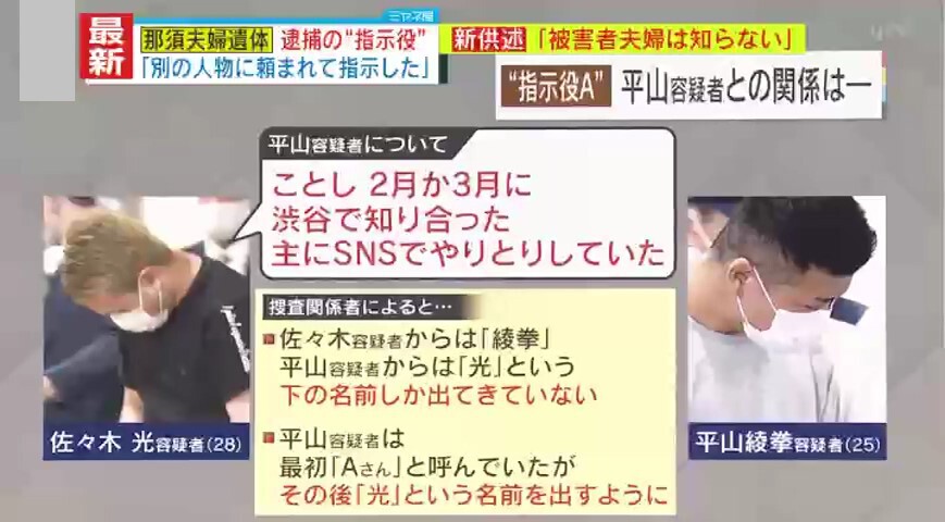 佐々木容疑者は、平山容疑者について「2024年2月か3月に、東京・渋谷で知り合った。主にSNSでやりとりしていた」と話しています。捜査関係者によると、それぞれの供述は「佐々木容疑者からは『綾拳』、平山容疑者からは『光』という、下の名前しか出てきていない」「平山容疑者は最初『Aさん』と呼んでいたが、その後『光』という名前を出すようになった」ということです。
