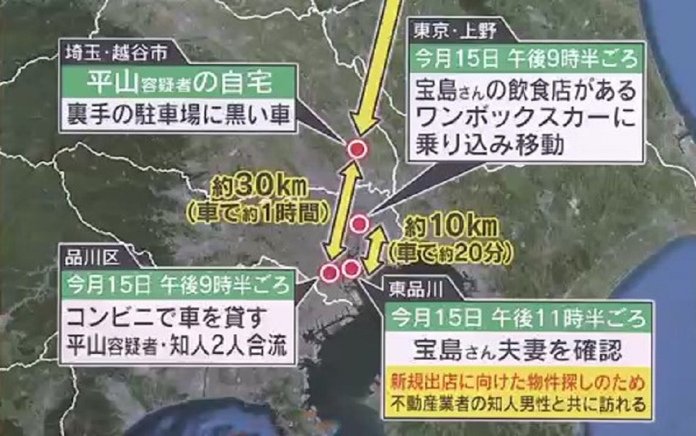 事件前日・4月15日の午後9時半ごろ、東京・上野からワンボックスカーに乗り込む宝島さんの姿が防犯カメラに映っていました。その同じ頃、平山容疑者は東京・品川区のコンビニで知人2人と合流し、車を貸したということです。その後、午後11時半ごろに東品川で宝島さん夫妻の姿が確認されていますが、新しい情報として、新規出店に向けた物件探しのために不動産業者の知人男性と共に訪れていたということです。