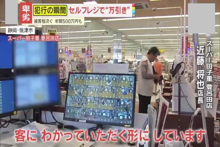 セルフレジを悪用した無人販売店や、スーパーでの万引きですが、『スーパー田子重 登呂田店』では、対策の一つとしてセルフレジの横に防犯カメラの映像を映していました。