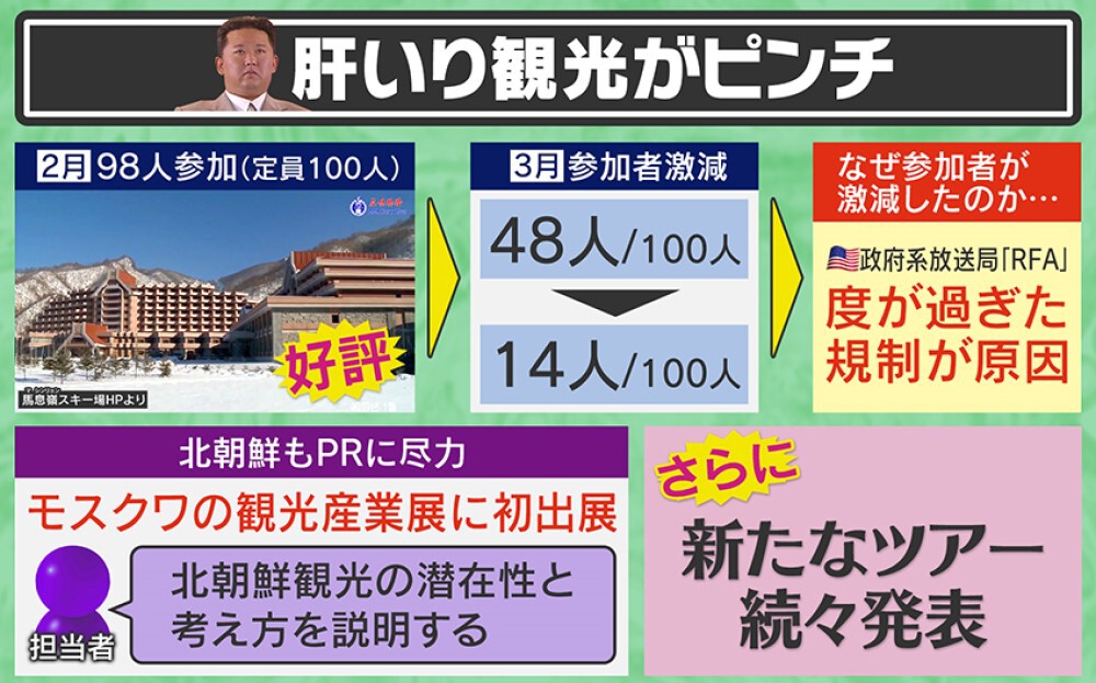金正恩総書記“肝いり観光事業”が、今ピンチだといいます。2024年2月時点では、定員100人に対し98人が集まっていましたが、3月に入って参加者が激減。最終的には、14人しか集まっていないということです。米・メディアは、「度が過ぎた規制が原因だ」と分析しています。