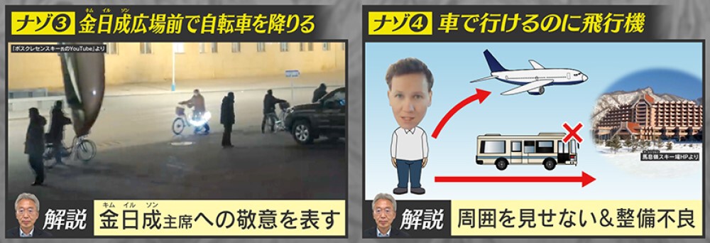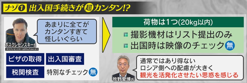 そんなボスクレセンスキー氏が現地で目にした、多くの“ナゾ”に迫ります。まず、ビザの取得・出入国審査・税関検査でも特別なチェックはなく、撮影機材はリスト提出のみで、出国時は映像のチェックがなかったといいます。ボスクレセンスキー氏は「あまりに全てが簡単すぎて怪しいぐらい」と話していて、牧野氏は「通常では、あり得ない。ロシア側への配慮が大きく、観光を活発化させたい思惑を感じる」との見解を示しています。