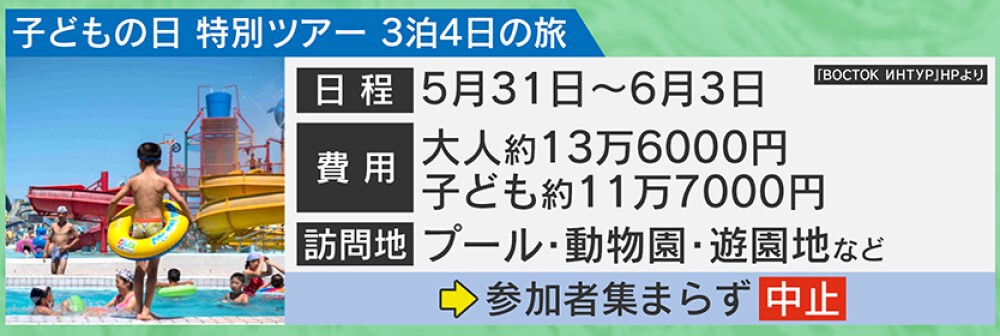 それが、『子どもの日・特別ツアー 3泊4日の旅』です。ロシアの子どもの日(6月1日)を含めた日程となっていて、費用が大人約13万6000円・子ども約11万7000円。プール・動物園・遊園地などが訪問地となっていましたが、参加者が集まらず、中止に…。