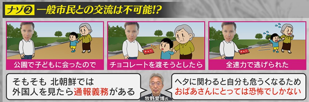また、ボスクレセンスキー氏は公園で、おばあさんと一緒にいる子どもに会ったのでチョコレートを渡そうとしたところ、なぜか全速力で逃げられ、現地の一般市民とは交流不可能だと感じたといいます。牧野氏によると「そもそも北朝鮮では、外国人を見たら通報しなければならない」、一緒にいたおばあさんの心理としては「下手に関わると自分も危うくなるため、おばあさんにとっては恐怖でしかない」ということです。