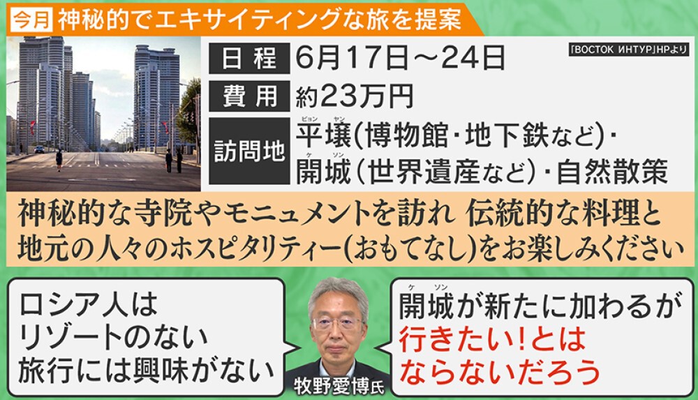 しかし、2024年6月17日~24日には『神秘的でエキサイティングな7泊8日の旅』を開催予定です。費用が一人約23万円で、平壌(博物館・地下鉄など)・開城(世界遺産など)・自然散策などが訪問地となっています。『神秘的な寺院やモニュメントを訪れ、伝統的な料理と地元の人々のホスピタリティーをお楽しみください』とありますが、牧野氏によると「ロシア人はリゾートのない旅行には興味がない。開城が新たに加わるが、行きたい!とはならないだろう」と指摘しています。
