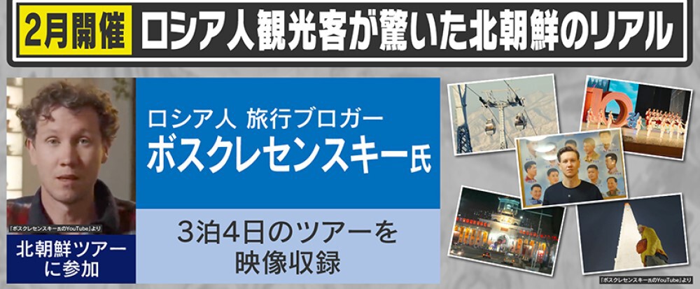 ロシア人の旅行ブロガー・ボスクレセンスキー氏は、2024年2月に開催された3泊4日の北朝鮮ツアーに参加。北朝鮮ガイドが「美しいものだけを写真に撮ってください」「ホテルを出ての散策は、ガイドと一緒でないと許可されません」と話す通り、多くの注意・禁止事項があり、どれが禁止行為かと常に緊張を強いられていたといいます。また、行き先の変更・自由行動などは一切許されませんでした。ボスクレセンスキー氏は、そうしたツアーの内容を収録した映像を自身のYouTubeに上げ、話題となっています。