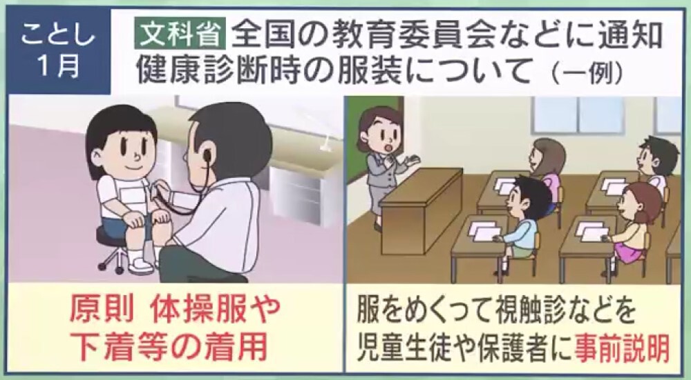 一方、2024年1月には、文科省が全国の教育委員会などに、健康診断時の服装について通知していました。一例として、「原則、体操服や下着等を着衣」「服をめくって視触診などを児童生徒や保護者に事前説明すること」などがあります。