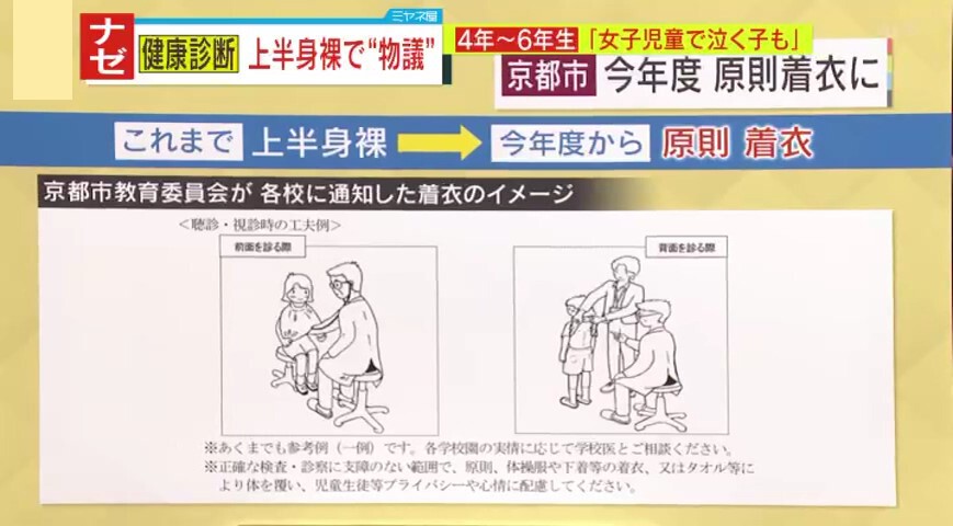 小学生の子どもを持つ親に話を聞くと、「変な考え方を持っている大人もいるので、子どもを守るためにも、4年生以降は着衣して健康診断を受けたほうがいい」「やるのであれば、女性だけのスペースを作って、女の子だけでやるのがいいのかなって。上半身裸でやることには賛成ですが、やり方ですね」と話していました。