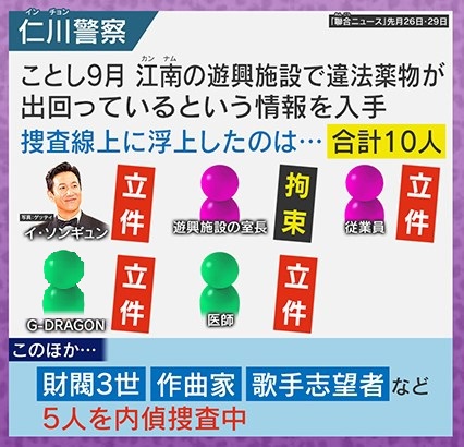 9月、仁川警察は江南のそういった遊興施設で違法薬物が出回っているという情報を入手し、捜査の過程でイ・ソンギュン氏に関する情報を入手、捜査線に10人の人物が浮上し、その中にイ・ソンギュン氏やG-DRAGON氏もいたということです。二人のほかにも遊興施設の室長や従業員、財閥3世、作曲家、歌手志望者もいたそうです。
