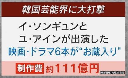 また、韓国映画界のトップスターで演技派俳優と知られている、ユ・アイン氏(37)も10月19日、麻薬類管理法違反などで在宅起訴されています。美容施術を口実に181回にわたり常習的に向精神薬の投薬を受けた罪などに問われています。これらの薬物スキャンダルでイ・ソンギュン氏とユ・アイン氏が出演した映画・ドラマ6本が“お蔵入り”、その製作費 約111億円ということで、韓国芸能界は大打撃をうけています。