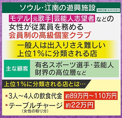 ソウル・江南に、モデルや元歌手 芸能人志望者などの女性が従業員を務める、会員制の高級個室クラブがあるということで、一般人は出入りさえ難しいといわれ、上位1%に分類される店で、主な顧客は、有名スポーツ選手・芸能人・財界の高位層などだそうです。その上位1%に分類される店とは、3人~4人の飲食代金 約89万円~110万円・テーブルチャージが約22万円だということです。