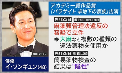 アカデミー賞作品賞「パラサイト半地下の家族」に出演していた俳優のイ・ソンギュン氏(48)が、10月23日、韓国の「麻薬類管理法違反」の容疑で立件されたということです。大麻など複数の違法薬物を使用していたと思われます。28日の簡易薬物検査の結果は“陰性”だったということです。