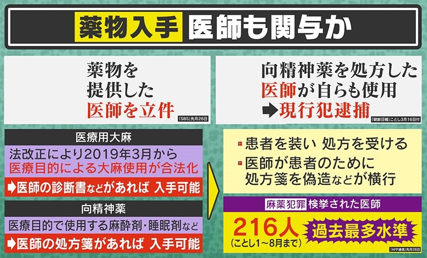 今回、イ・ソンギュン氏やG-DRAGON氏に薬物を提供した医師も立件しています。また、ユ・アイン氏に向精神薬を処方した医師が自らも使用したとして、現行犯逮捕されています。韓国の薬物に関する法律ですが、法改正により2019年3月から医療目的による大麻使用が合法化されていて、医師の診断書などがあれば入手可能となっています。医療目的で使用する麻酔剤・睡眠剤・向精神薬も医師の処方箋があれば入手可能です。しかし、患者を装い処方を受けたり、医師が患者のために処方箋を偽造するなどの行為が横行し、麻薬犯罪で検挙された医師は今年1~8月までに216人と過去最多水準となっているということです。