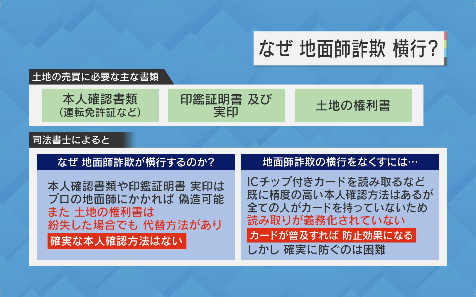 しかし、司法書士によると、「本人確認書類や印鑑証明書・実印は、プロの地面師にかかれば偽造可能。また、土地の権利書は紛失した場合でも代替方法があり、確実な本人確認方法はない」ということです。