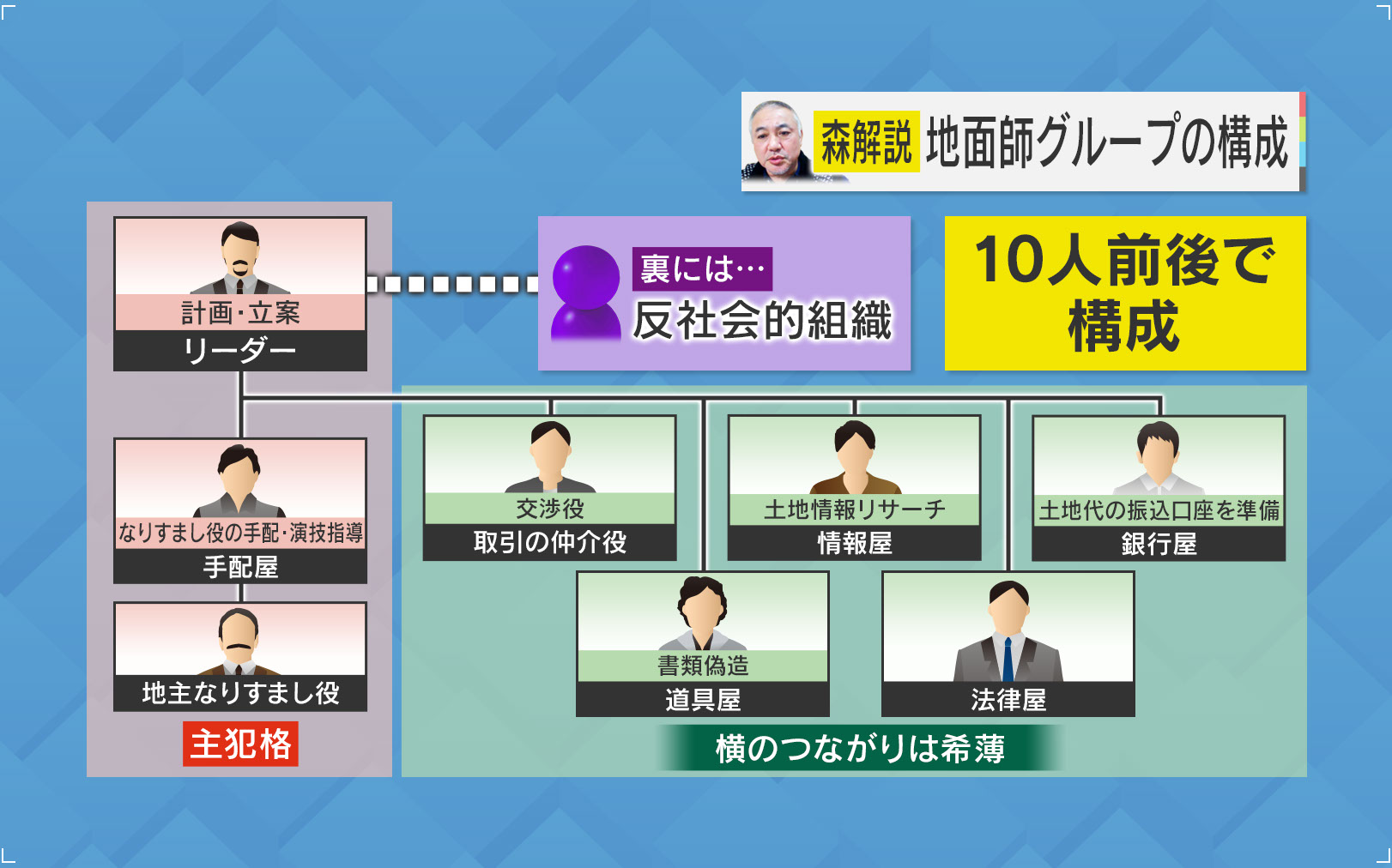 今回の事件での具体的な構成は不明ですが、森氏によると、地面師グループの裏には反社会組織がいます。グループは10人前後で構成され、役割を分担して犯行に及びます。主犯格はリーダー・その下にいる“なりすまし役”の手配や演技指導を行う『手配屋』、そして『地主のなりすまし役』です。『法律屋』『道具屋』『銀行屋』の他にも交渉役の『取引の仲介役』や土地情報をリサーチする『情報屋』などがいて、横の繋がりは希薄だということです。