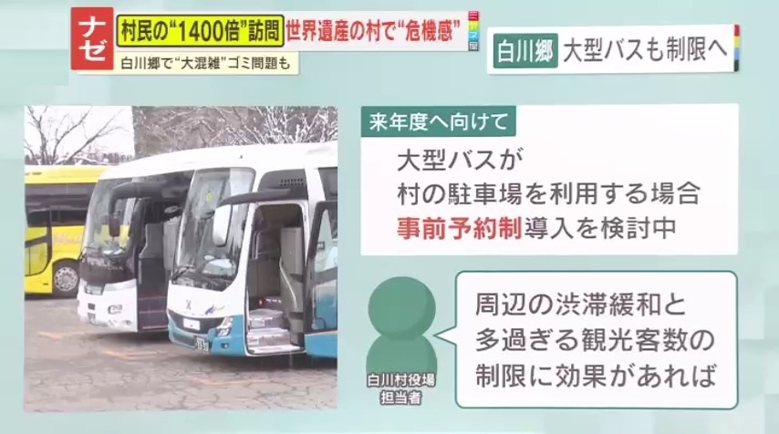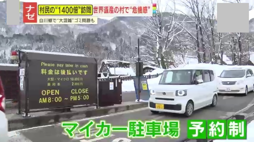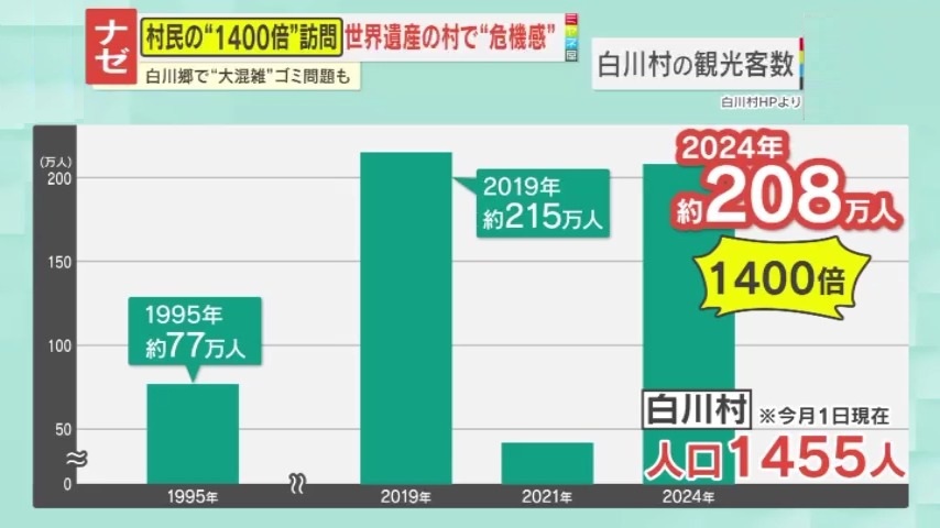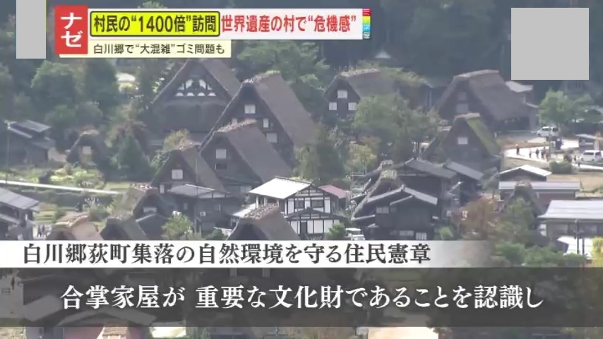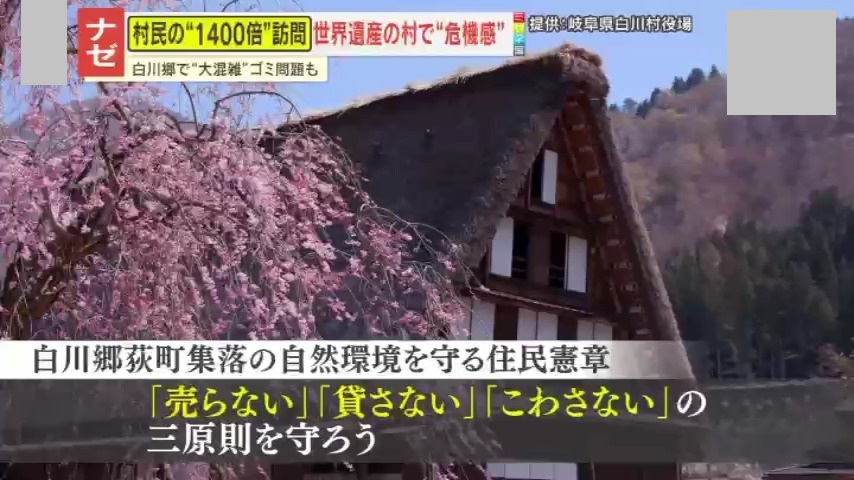 合掌造りの里として有名な岐阜県の白川郷では、村の人口の1400倍もの観光客が押し寄せているといい、大混雑やゴミ問題などで、住民たちの間には危機感が広がっているといいます。村の人口減少も進み、観光業と住民の暮らしの両立に課題は山積。そんな中で、白川村が打ち出した新たなオーバーツーリズム対策とは。