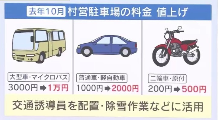 2025年10月から、村営駐車場の料金を値上げしました。大型車、マイクロバスは3000円から1万円に。普通車・軽自動車は1000円から2000円に。二輪車・原付は200円から500円になりました。交通誘導員を配置し、除雪作業などに活用するということです。