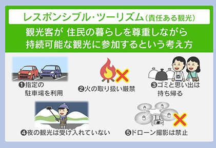 ①指定の駐車場を利用 ②火の取り扱いは厳禁 ③ゴミと思い出は持ち帰る ④夜の観光は受け入れていない ⑤ドローン撮影は禁止