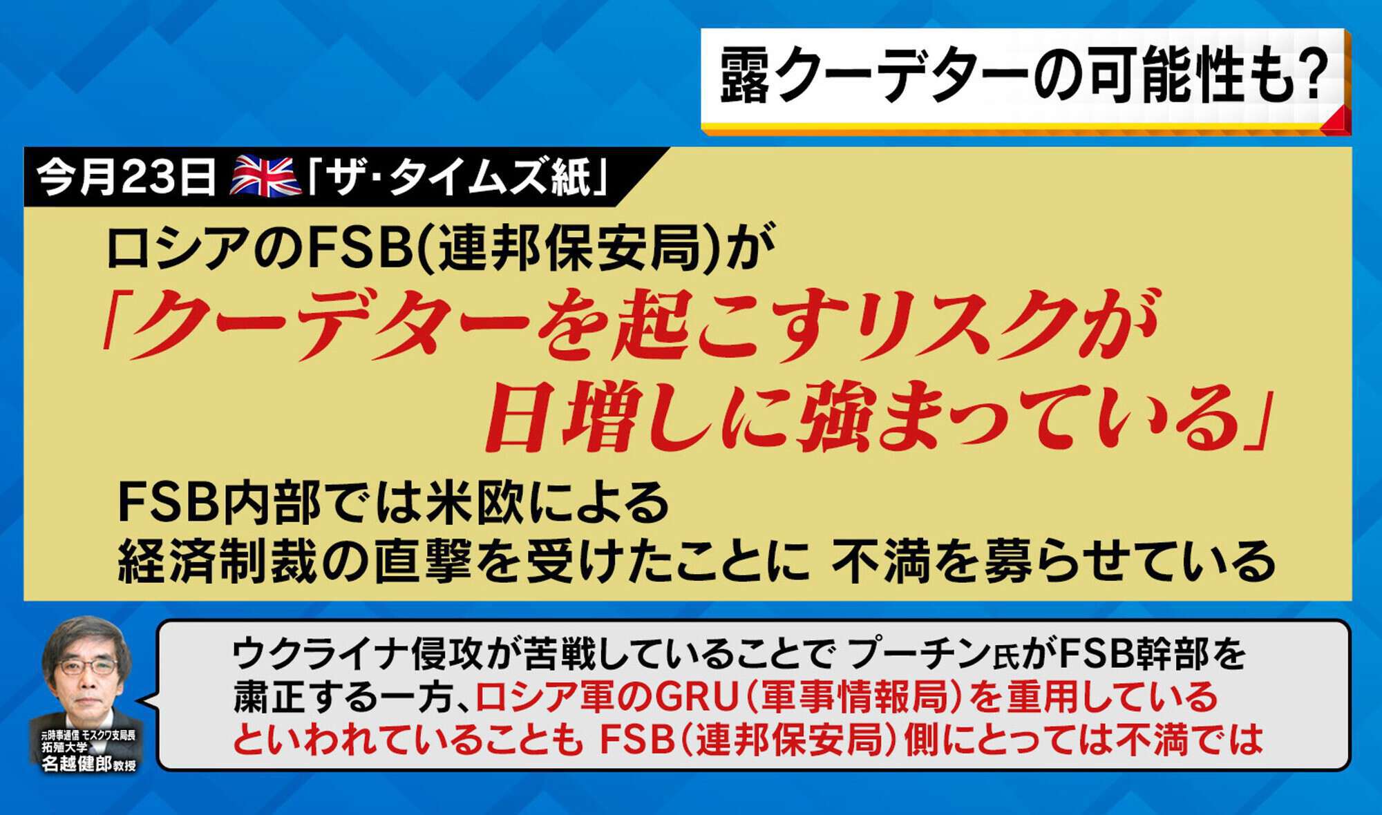 名越教授は「ロシア国内でプーチン氏に不満をもつ者がいてもあくまで個人レベルでクーデターには組織的な反乱が必要。今後組織的な反乱が起こる可能性があるとすれば、ロシア軍が生物化学兵器を使用した場合ロシア国内でも『一線を越えた』と受け止められる可能性がある。」としています。
