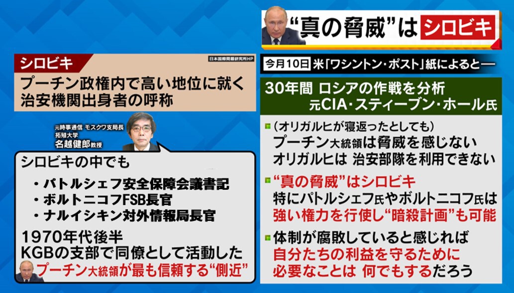 そして、30年間ロシアの作戦を分析している、元CIAのスティーブンホール氏によると「オリガルヒが寝返ったとしてもプーチン大統領は脅威を感じない。オリガルヒは治安部隊を利用できない。真の脅威はシロビキ。特にパトルシェフ氏やボルトニコフ氏は強い権力を持つだけでなく利用し、暗殺計画も可能。体制が腐敗していると感じれば自分たちの利益を守るために、必要なことは何でもするだろう」ということです。