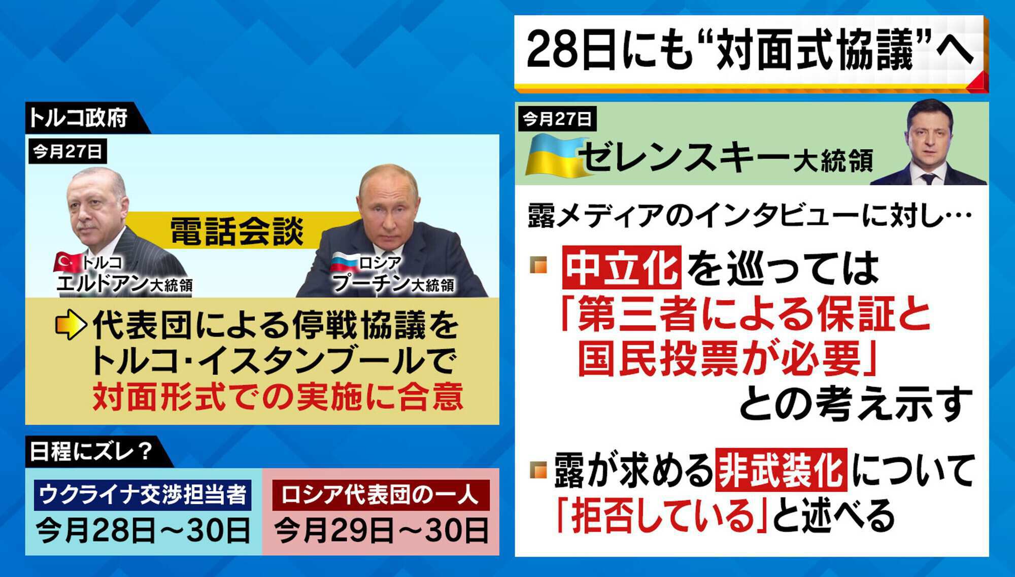 「進展というよりも、プーチン大統領としてはこうして停戦協議に応じている、ロシア側の言い方であれば『停戦を持ち掛けているのにウクライナが拒否している』とういうことになるんだと思いますが、反対にウクライナ側としてはできるだけこの停戦協議を延ばさなくてはならないのです。この停戦協議が終われば、決裂したということでロシア側が一気に攻勢をかけくるということになります。ただロシア側がこれをのんでいるのは、まだ大規模な軍事攻勢がかけられないから、その準備のために時間をかせいでいるのだと思います。ウクライナ側の方が一つ一つの問題について議論を持ち出して、延ばしているという印象は持っています。」