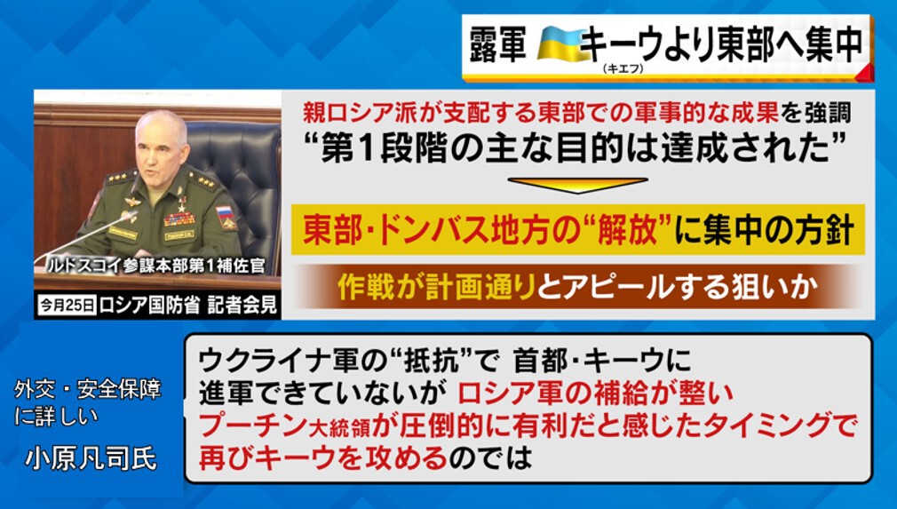 「そうですね。プーチン大統領は2月21日の演説で『東部2州の独立の承認が目的だ』と言いましたが、その3日後の24日にいきなり『ウクライナの非武装・中立・非ナチ化という政権交代』というものに戦争目的を拡大して一気に全面戦争に出て行ったということで、戦争目的を2月21日の最初の段階に戻そうとするということは、やはりキーウ攻略がうまく進んでいない、苦戦しているという反省もあるかもしれないです。ただ、落としどころがどうなるかはまだ全く読めないと思います。」