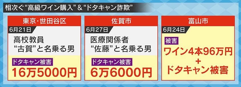 同様の詐欺は全国で相次いでいて、東京都世田谷区では、高校教員の“古賀”と名乗る男から16万5000円のドタキャン被害がありました。佐賀市では医療関係者の“佐藤”と名乗る男から6万6000円の被害が。富山市ではワイン4本96万円を払ってしまった上に、ドタキャン被害に遭ったということです。