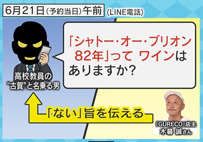 6月21日(予約当日)になると、男から「『シャトー・オー・ブリオン82年』ってワインはありますか」とLINE電話がかかってきますが、木暮さんは「ない」という旨を伝えました。