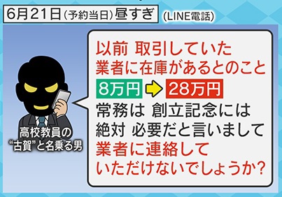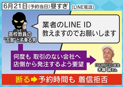 さらにその後、「業者のLINEのIDを教えますのでお願いします」と何度も取引のない会社へ、店側から発注するように要望が来たということです。木暮さんは断りましたが、その日、予約時間になっても古賀と名乗る男らは現れず、着信も拒否されてしまいました。