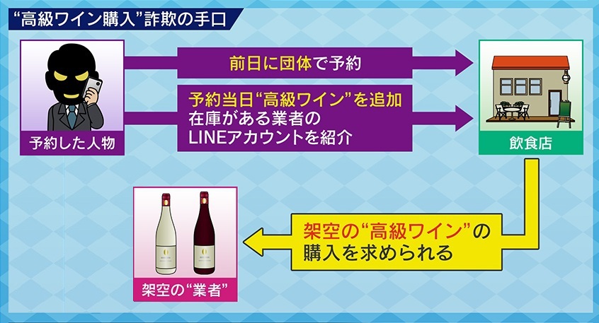 「今までも、お店に大量の人数で予約して、その客が来ないという手口の犯罪はありましたが、大量の人数を申し込んで、さらにそこから高級ワインの金額を騙し取るという手口は、私は初めて聞きました。今の犯罪組織というのは、ニセの電話番号や、SNSアカウントなどを持っていますので、こういう手口はできるなという感じがします」