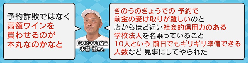 「予約詐欺ではなく、高額ワインを買わせるのが本丸なのかなと。きのうのきょうでの予約で、前金の受け取りが難しいのと、店からほど近い社会的信用力のある学校法人を名乗っていること、10人という前日でもギリギリ準備できる人数など、見事にしてやられた」