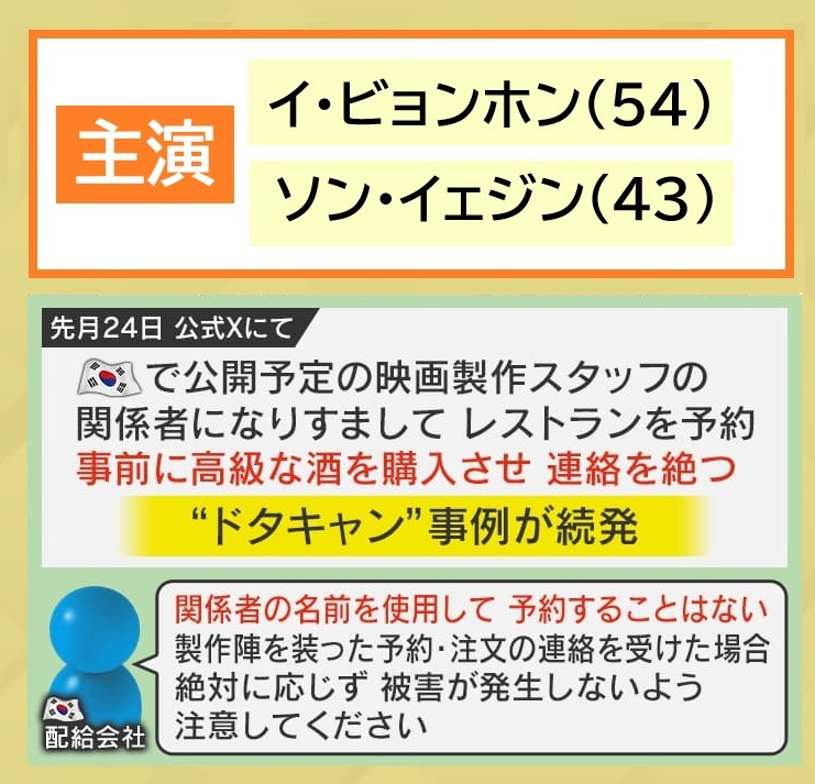 2025年6月24日には、韓国で公開予定の映画製作スタッフの関係者になりすましてレストランを予約し、事前に高級な酒を購入させ連絡を絶つというドタキャン事例が続発していると、公式『X』が発表しました。