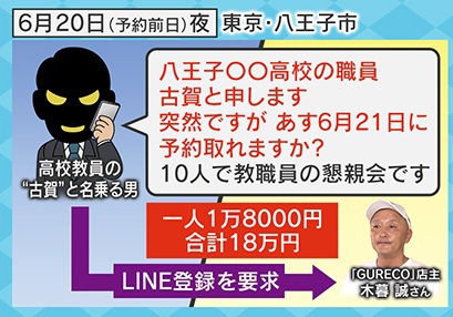 東京八王子市の飲食店で、2025年6月20日(予約前日)の夜に、高校教員の“古賀”と名乗る男から「八王子〇〇高校の職員、古賀と申します。突然ですが、あす6月21日に予約取れますか?10人で教職員の懇親会です」という電話がありました。