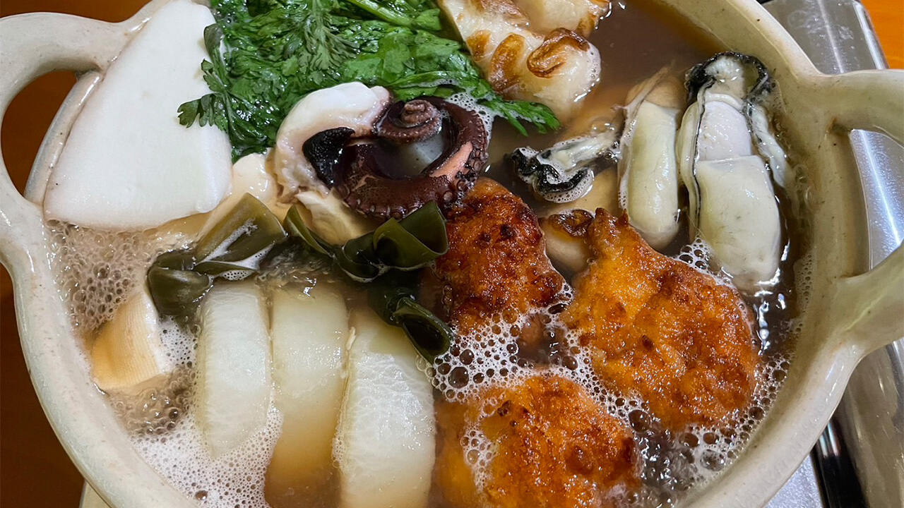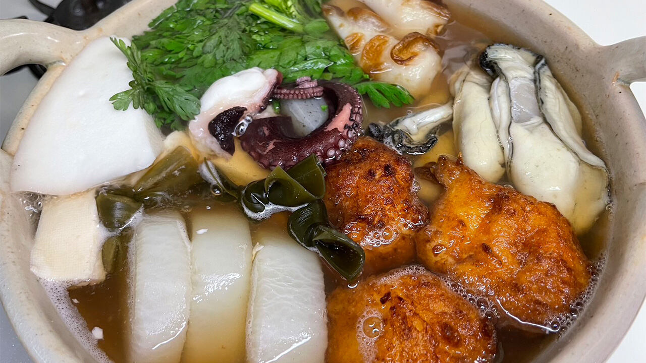 ⑤ タコ、牡蠣、海老しんじょ、はんぺん、豆腐を加え、5分ほど煮る